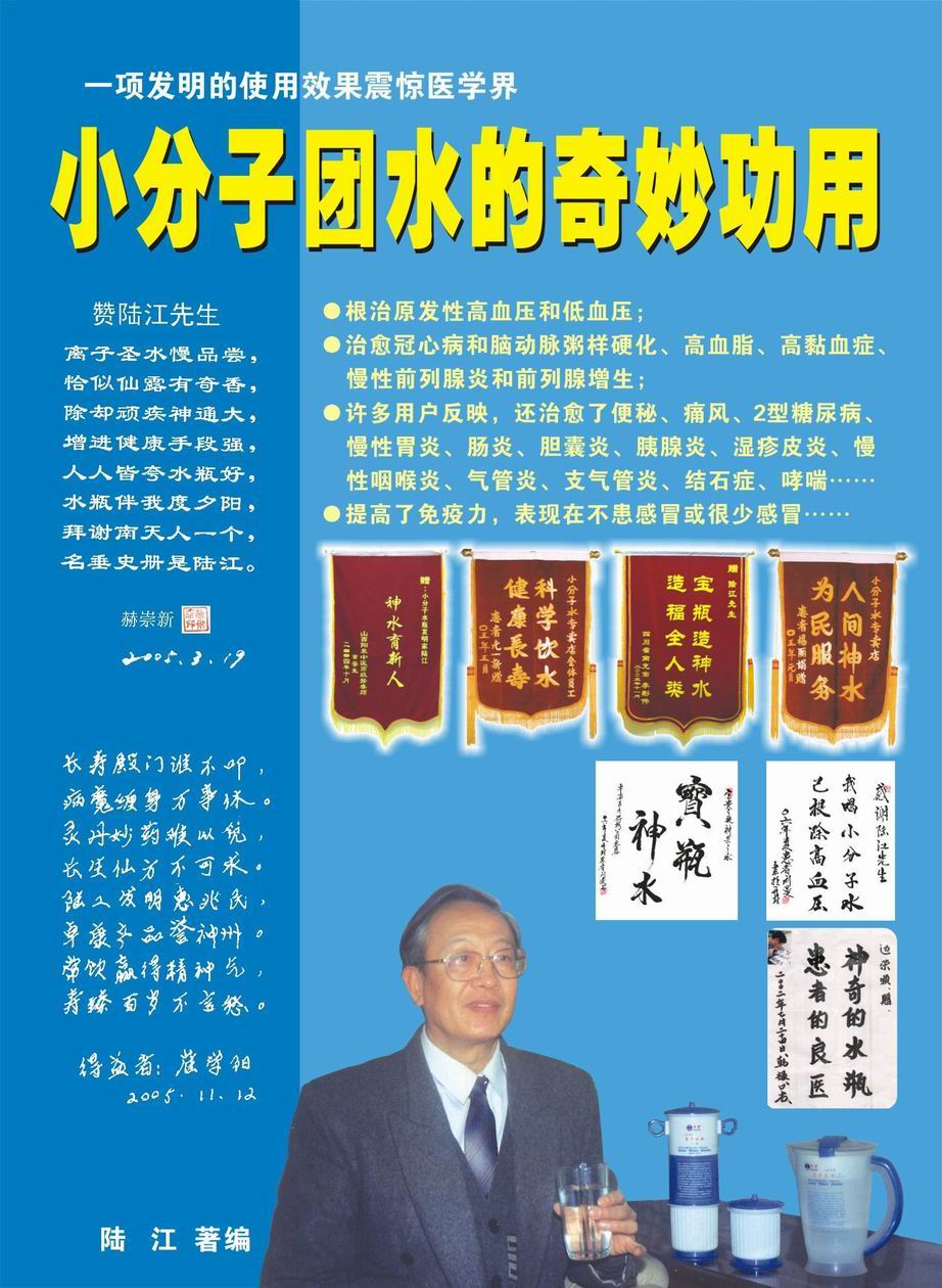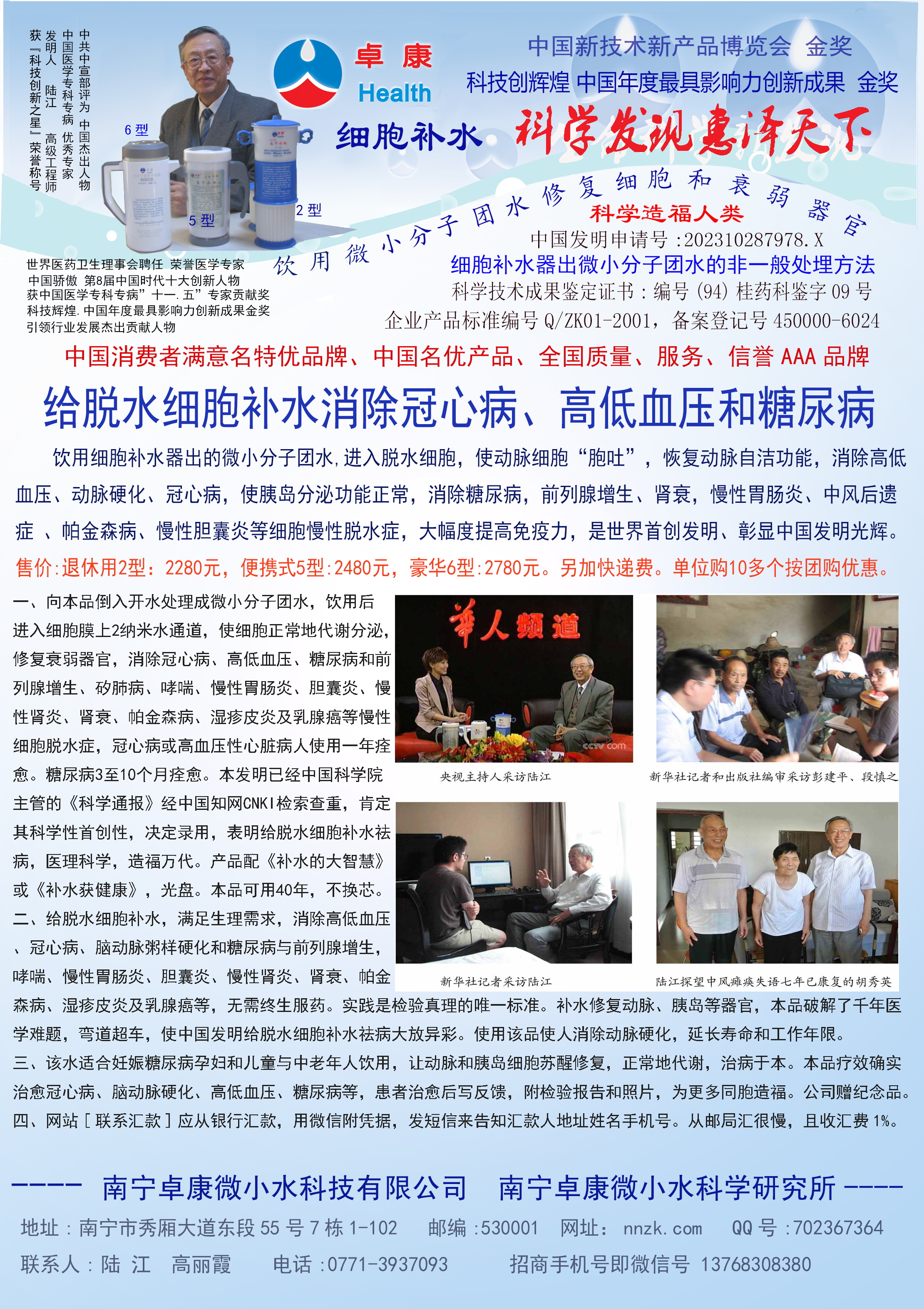 人類幾千年來患以上病癥需終生服藥,幾十年也不能治愈。可是我國南寧的高級工程師陸 江,于1990年想根治高血壓,研究發(fā)明了離子水瓶,處理出微小分子團水供飲用,經(jīng)過醫(yī)院臨床試用和專家鑒定,1999年獲中國發(fā)明專利權,產(chǎn)品于2000年投放市場后一直跟蹤調查,據(jù)全國各地用戶反饋:祛除了高低血壓、糖尿病和冠心病,并使前列腺增生、咽喉炎、鼻竇炎、慢性氣管炎、支氣管炎、矽肺病、哮喘、慢性胃炎、腸炎、慢性膽囊炎、慢性腎炎、腎衰、膀胱炎、便秘、痔瘡、風濕性關節(jié)炎和濕疹皮炎及中風后遺癥等病癥不藥而愈。為什么喝微小水能治20多種???陸 江從1991年德國科學家發(fā)現(xiàn)細胞膜水通道僅為2納米獲得啟發(fā),認為多種器官患病是因細胞脫水,不能正常代謝和分裂增殖,才使器官細胞減少致衰弱萎縮而形成細胞缺水性病癥。22年來的實踐有力地支持了“細胞脫水致病”這一重要論點,表明喝微小水可滿足細胞的生理需求,補水就能祛病,是生命科學新亮點。
