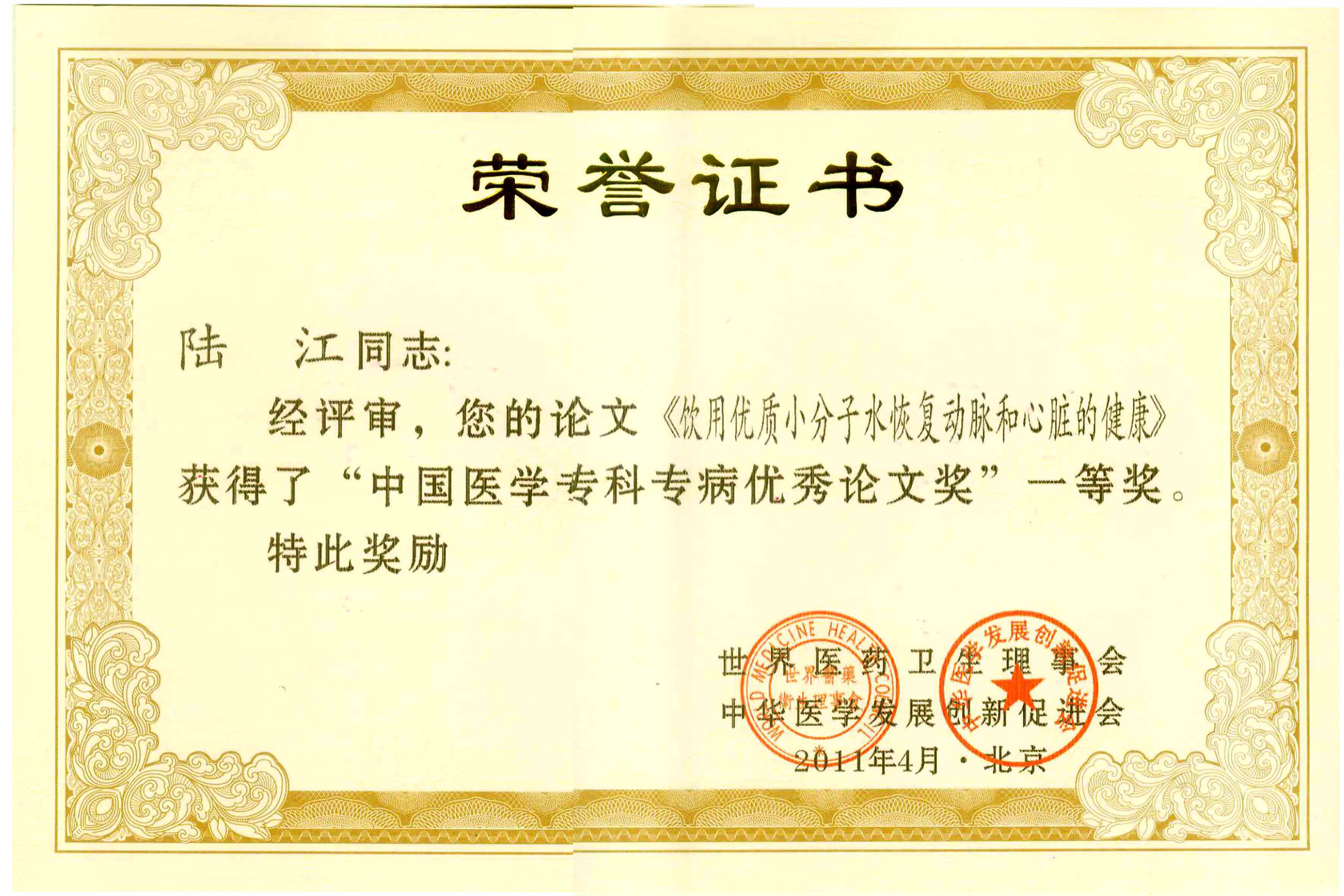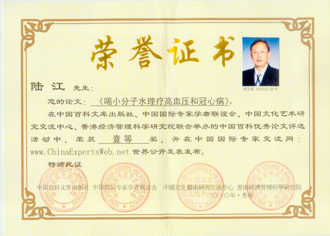 -----我是從事建筑的高工,本來沒有資格去攻克醫(yī)學難題,卻為了自身健康才扣響醫(yī)學的大門。由于我1990年患高血壓,因怕中風才研究發(fā)明了離子水瓶,我把水處理成微小分子團水,飲用后治愈了高血壓。便于1993年底送到三家省級醫(yī)院做臨床試用4個月。經(jīng)北京和廣西醫(yī)學專家鑒定:"降脂降壓效果好"," 能擴大心腦動脈流量,改善心腦電圖以及微循環(huán)","對治療心腦動脈粥樣硬化、高血壓、高血脂有良好的醫(yī)療保健作用。""產(chǎn)品的技術性能和療效達到了同類產(chǎn)品的國內領先水平,經(jīng)廣西醫(yī)學科學情報研究所檢索,未見國外有類似報道。"中國醫(yī)學科學院張正國教授從美國國立醫(yī)學圖書館數(shù)據(jù)庫存Medline檢索英俄文資料,均未見類似報告。2000年上市后,我為了對消費者負責而繼續(xù)觀察研究,一直通過《信譽卡》和《質量跟蹤調查書》向患者承諾療效,請用戶使用6個月后反饋效果。和脂壓患者飲用2至5個月內,消除癥狀,停服藥物,血壓正常;冠心病患者飲用3~5個月逐漸減輕至消除心絞痛、房顫等癥狀,不再服藥,飲用1年左右心電圖正常,經(jīng)冠脈造影掃描無明顯狹窄,表明冠心病痊愈。大量患者還反映許多衰弱器官被修復,讓前列腺增生、慢性咽喉炎、慢性氣管炎、支氣管炎、慢性胃炎、腸炎和膽囊炎等不藥而愈;2型糖尿病患者是因為胰島衰弱致病,飲用該水半年至一年,逐漸減藥至停藥,血糖尿糖正常,真正治愈2型糖尿病。中風后遺癥患者飲用六七個月,可逐漸減輕至消除肢體和語言障礙,表明飲用該水能讓壽命很長的神經(jīng)元細胞逐漸修復,奇跡般地恢復肢體和語言功能。飲用后還使胸腺和脾臟兩個重要的免疫器官被修復和增強,產(chǎn)生免疫細胞多,提高了免疫力,使人不生病或少生病。自此, 飲用微小分子團水創(chuàng)造了攻克冠心病、高(低)血壓和糖尿病三大醫(yī)學難題的奇跡。人們對此感到不可思議,但實踐是檢驗真理的唯一標準。